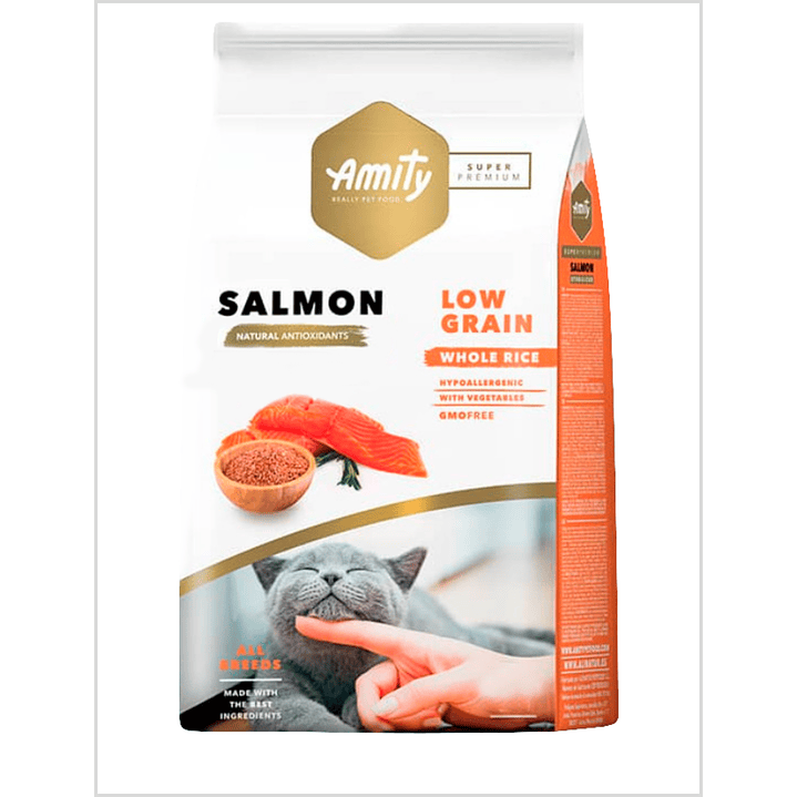 Amity Low Grain Salmón es un alimento premium formulado para gatos adultos, ideal para quienes buscan una dieta equilibrada, sabrosa y de fácil digestión. Su fuente principal de proteína es el salmón, ingrediente de alto valor biológico que favorece una piel saludable, un pelaje brillante y una condición física óptima.